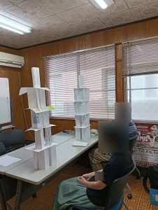 その後、ペーパータワーの作成。参加者同士で、どうしたら崩れないように紙を高く積み上げられる